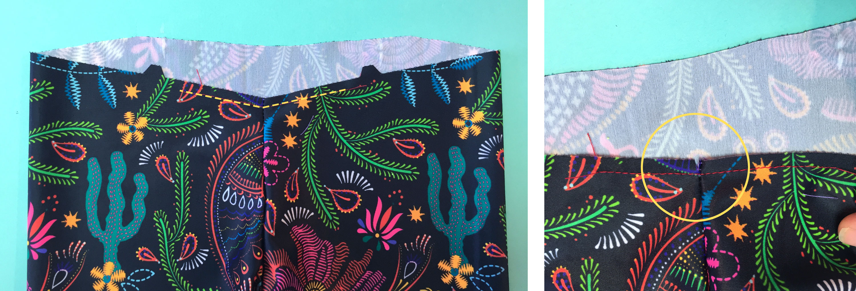 Insert the waistband into the leggings, the side without zigzag against the right side of the fabric, matching notches and centers and stitch.