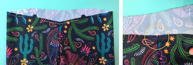 At center back, on the legging piece, sew a guide seam 6 m (1/4'') from the edge, as shown below. Then, clip at center back without cutting the guide seam thread: