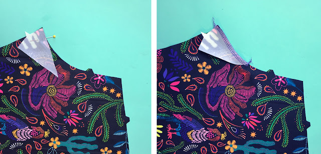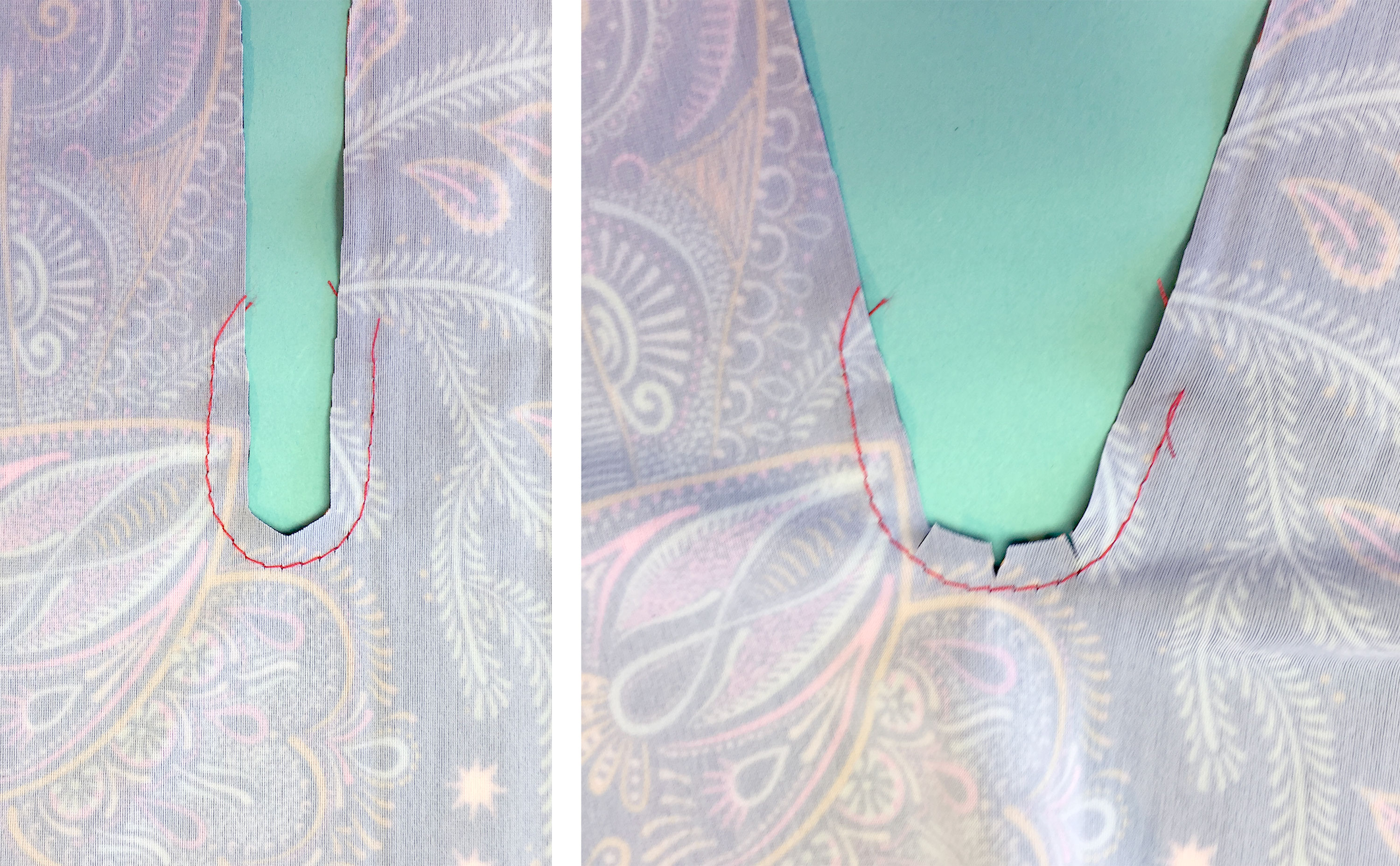 On the front piece, sew a guide seam 6 mm (1/4'') from edge and clip the curve up to the thread, but without cutting it: