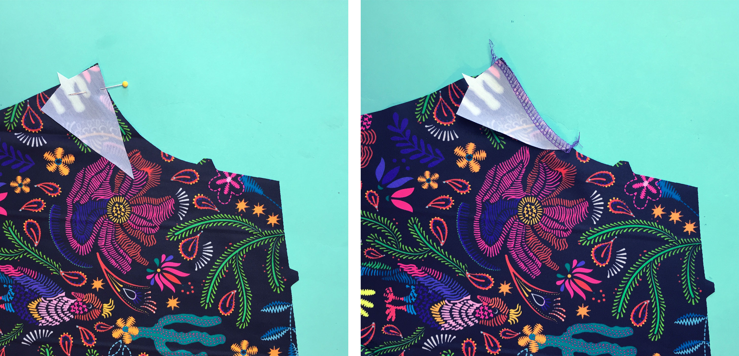Because the fabric we are using for the yoke is thinner we cut two pieces and join them, wrong sides together, with a zigzag to create a new, thicker yoke that will be more opaque: