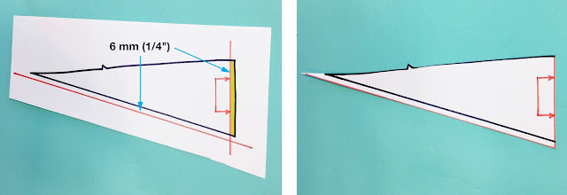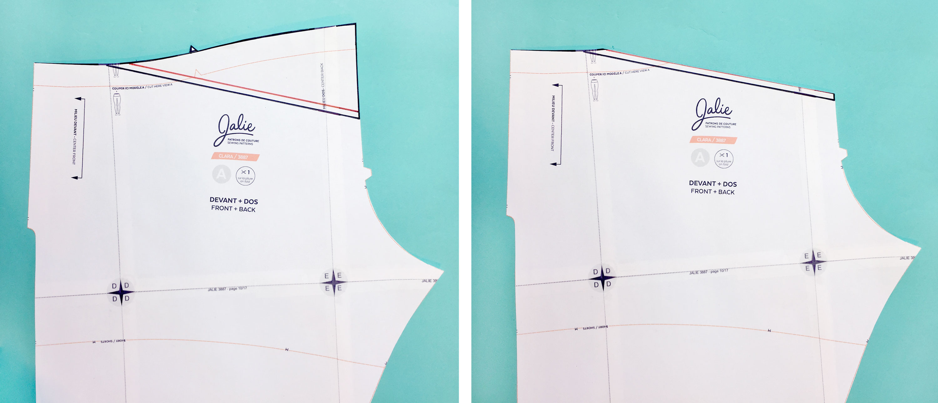 On piece A, add a seam allowance 6 mm (1/4'') above the angled line and cut your piece on that new line. Your front/back piece is now ready to be cut in fabric!