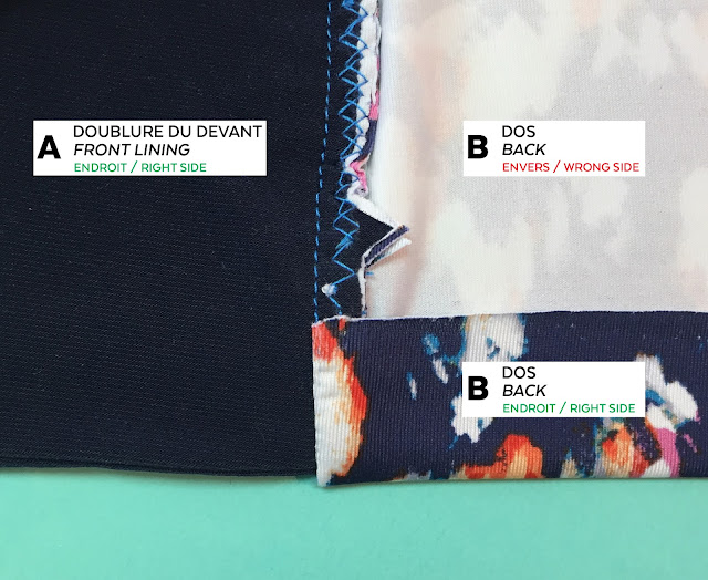 Bring the front LINING over the basted seam, pin and stitch 6 mm (1/4'') from edge, without stretching the fabric: