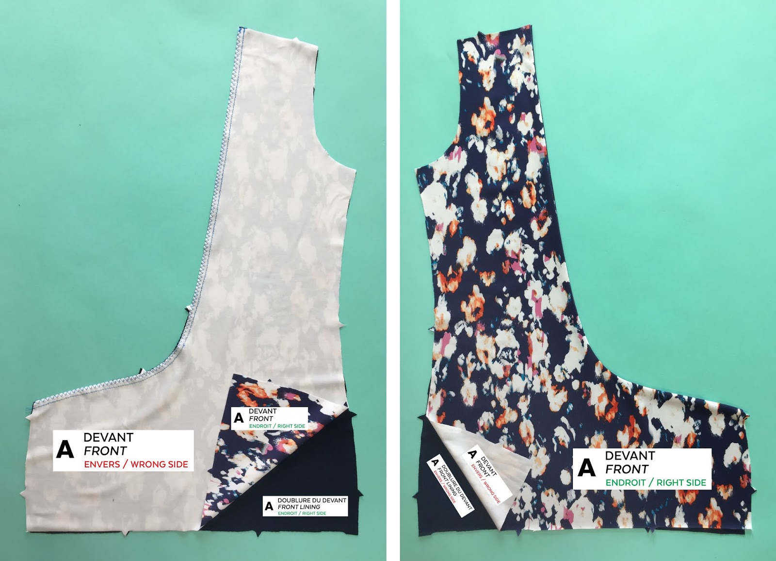 For the first run, picking fabrics that have different right/wrong sides will help you better understand the instructions. Using a contrast front lining fabric will also help.For this tutorial, we will be using a printed polyester knit (ITY). This type of fabric is easy to find and usually very affordable. Perfect for your first drop-pocket cardi!