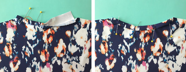 The first step is to finish the back neckline. Pin RIGHT SIDE of back neck binding to WRONG SIDE of back neckline, matching ends and centers. Baste with a zigzag and stitch 6 mm (1/4'') from edge, using a straight stitch:Fold binding wrong sides together, its raw edge along the seam. Fold the wrapped seam allowance to the right side of the back and pin: