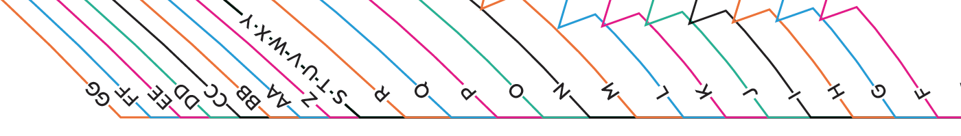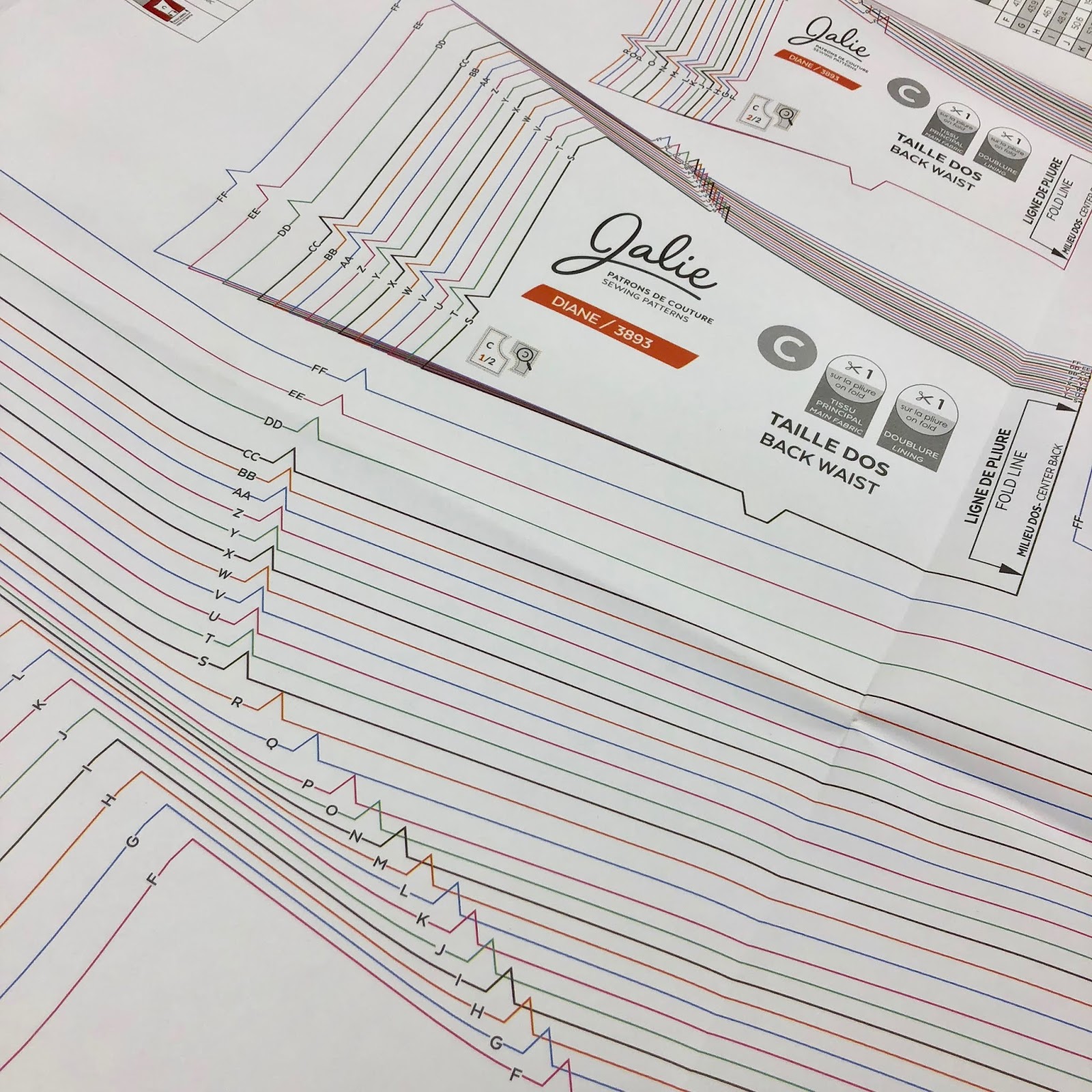 Patterns 2907 and up have colour-coded lines. Once you know which size you want to use (the Jalie size, which is a letter between F and GG), locate it on the piece and follow the line all around. The tiny letters you see on the pieces are added manually. It might happen that two letters were inverted by accident on a pattern. Don't worry about it. If you are on the right line, have seen the same letter all around, keep going on your line (and send us a quick email so we correct it for the next reprint).
