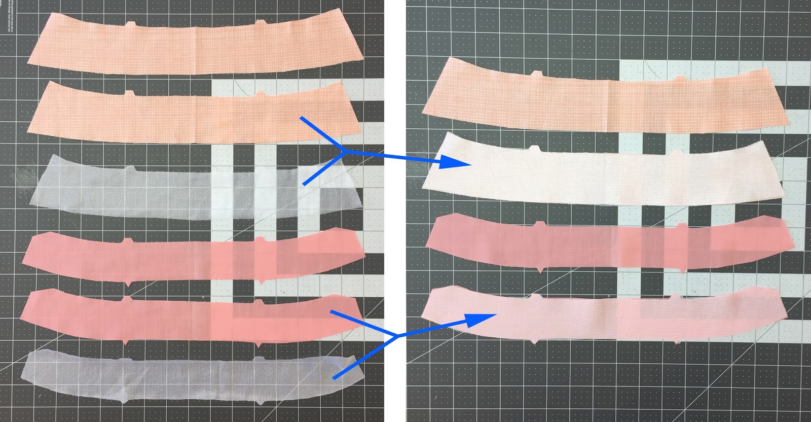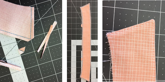 For a nice and crisp collar, you need to interface one collar and one collar stand piece. Apply fusible interfacing to the wrong side of the two pieces. Make sure notches are cut neatly to differentiate between single (triangle) and double (trapeze) notches:Trace a line, 1 cm (3/8'') from edge, on the interfaced side of the collar with chalk or a pencil:
