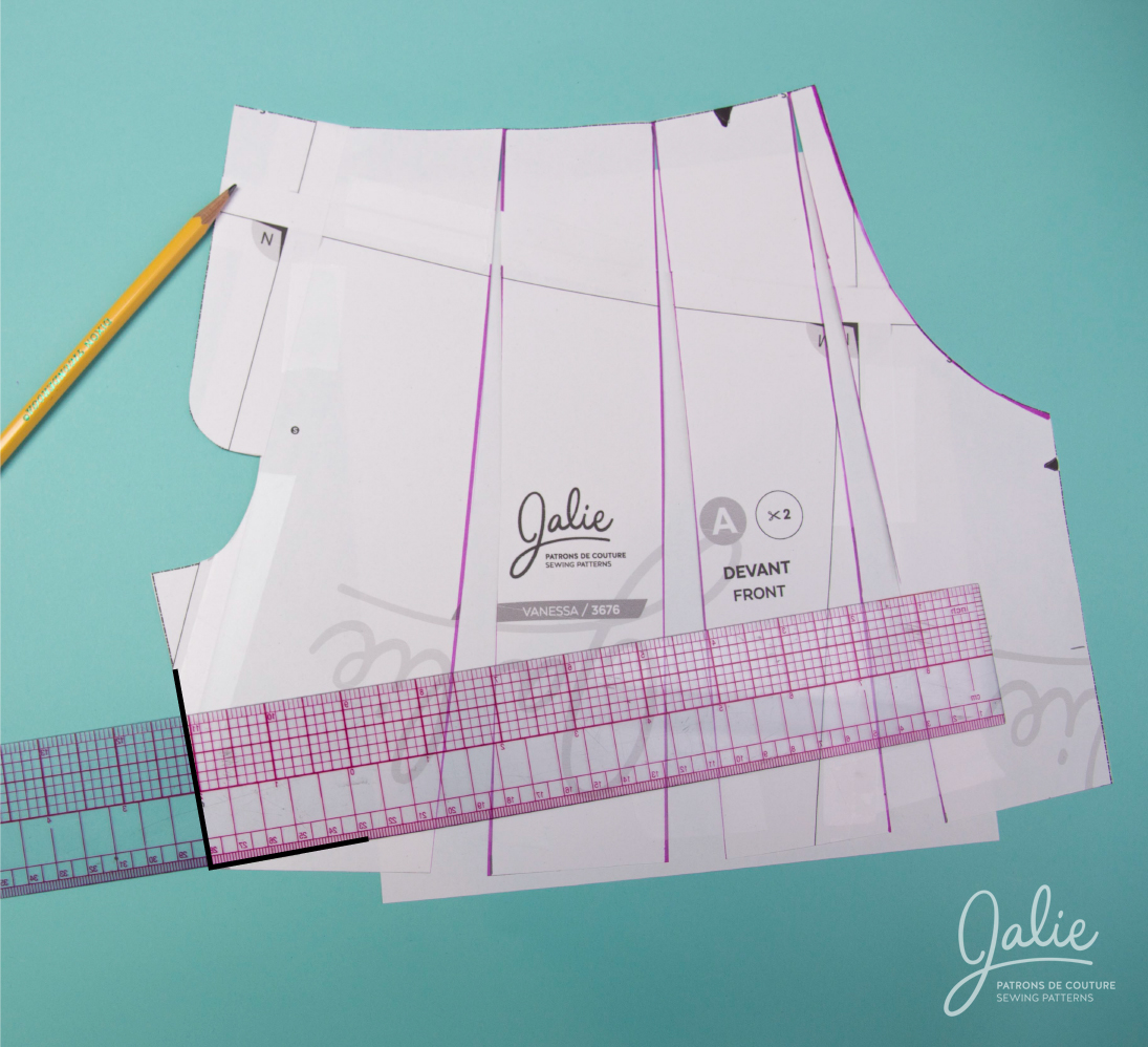 4. Measure approximately 5'' (12,5 cm) below the side seam notch (red line) on front and back pieces.