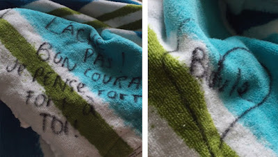 The first thing Éléonore asked for when she woke up at the hospital was "mommy, can you pass me the lucky towel my new friend gave me yesterday?". I reached for the beach towel an animator gave her the night before and broke into tears when I saw, written with a Sharpie, "BE BRAVE, I AM THINKING OF YOU, ♥ Bidule ". A totally unexpected, generous and thoughtful gesture that made a big difference for my little one.