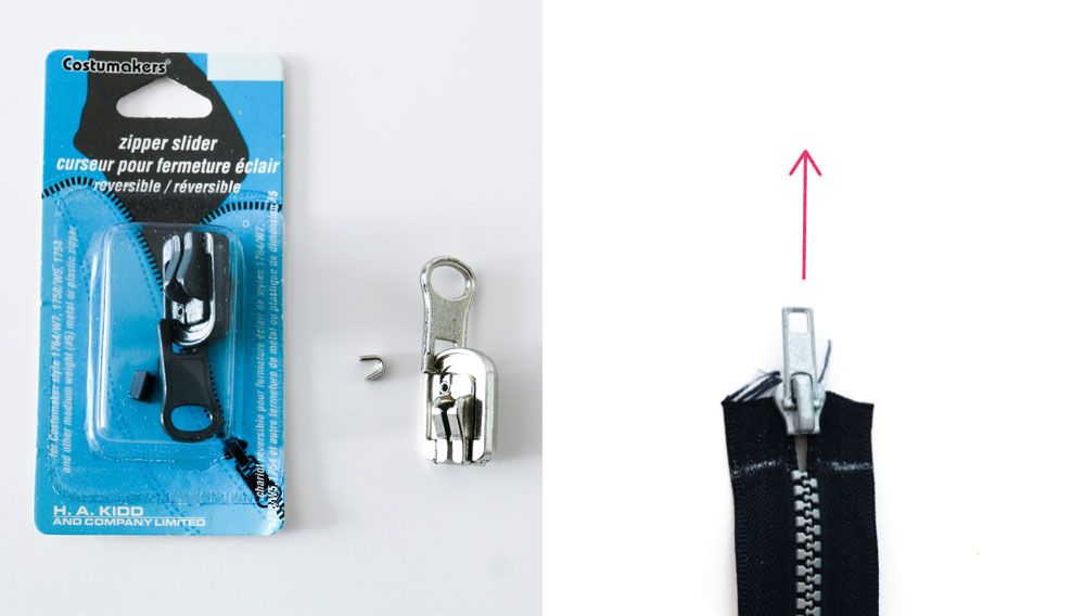 Les fermetures à glissière réversibles ne se trouvent pas facilement en magasin et sont plutôt chères. Vous pouvez la faire vous même avec une fermeture à glissière DÉTACHABLE et un CURSEUR RÉVERSIBLE (celui-ci plus facile à dénicher!). Il vient avec un arrêt dans son emballage.