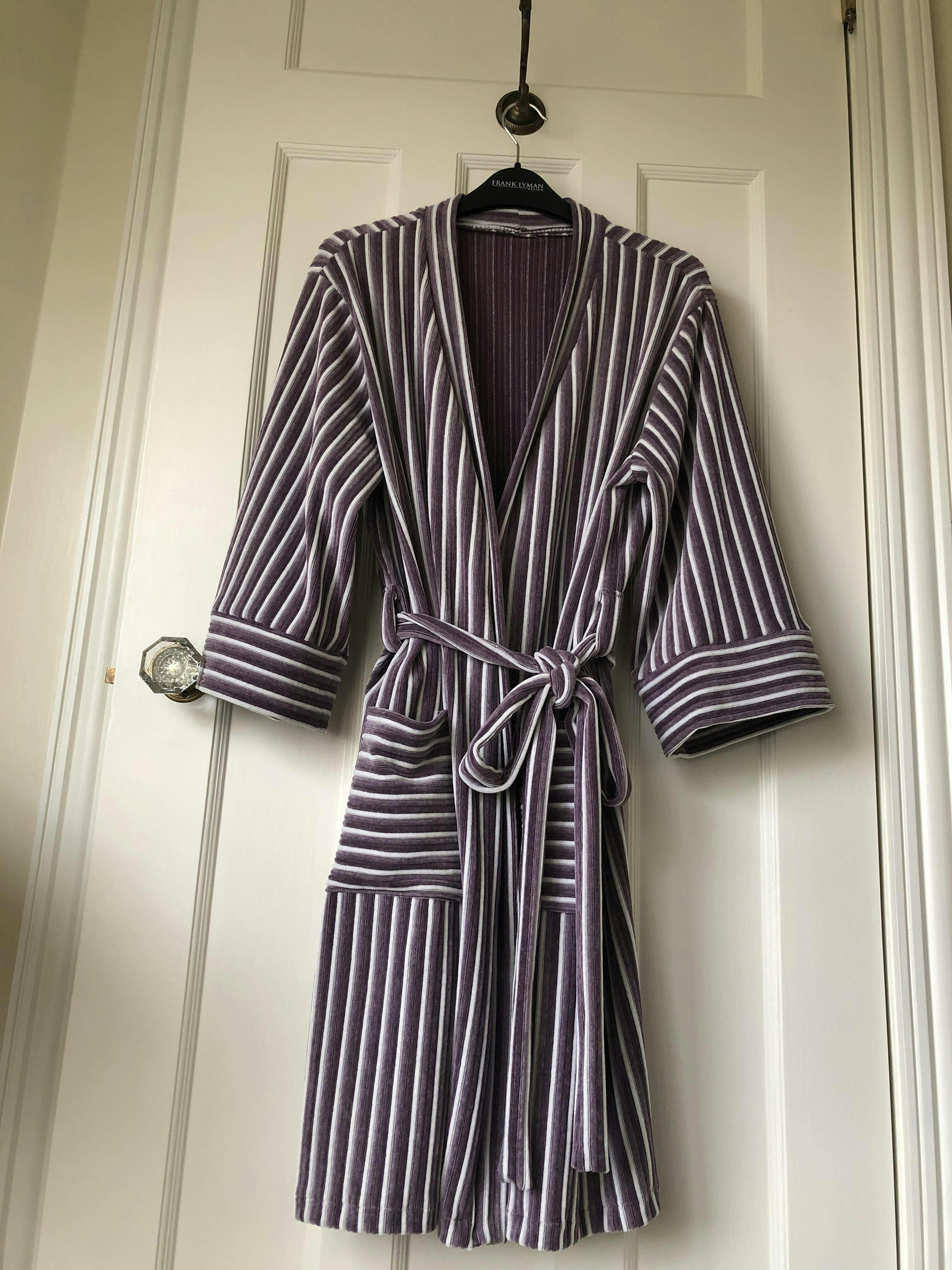 finition professionnelle. Des ganses maintiennent la ceinture à la taille, et de grandes poches plaquées sont ajoutées à l'avant. Une attache intérieure garde le peignoir fermé, et une autre à l'encolure permet de l'accrocher. Conçu pour les tricots, idéal pour se détendre à la maison.