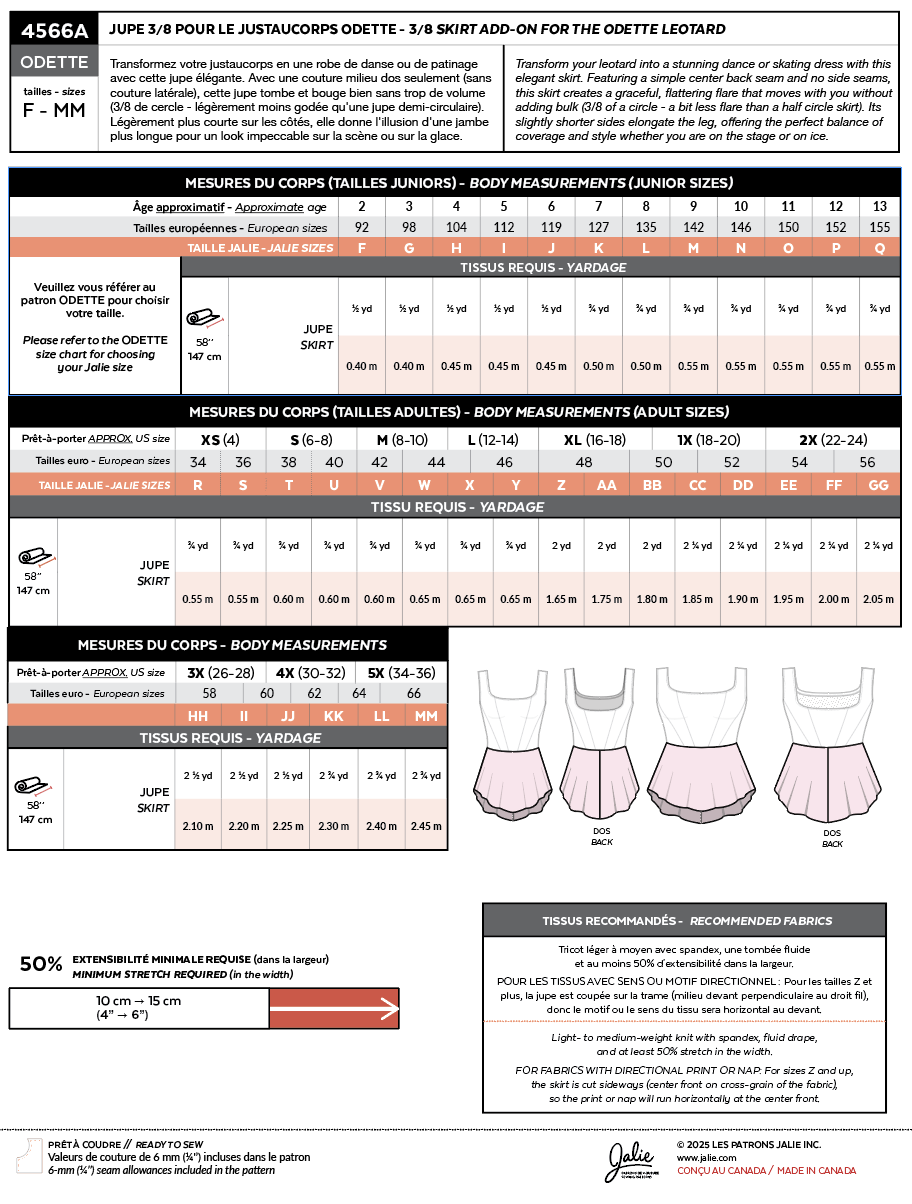 Cet ajout de jupe est conçu pour être cousu sur le justaucorps ODETTE, mais est aussi compatible avec les justaucorps FIONA, EMMA et OLIVIA (vendus séparément).