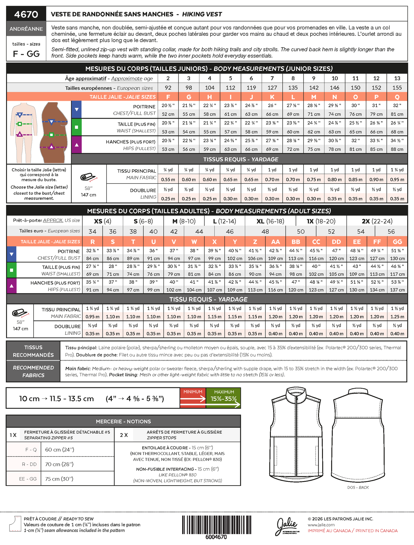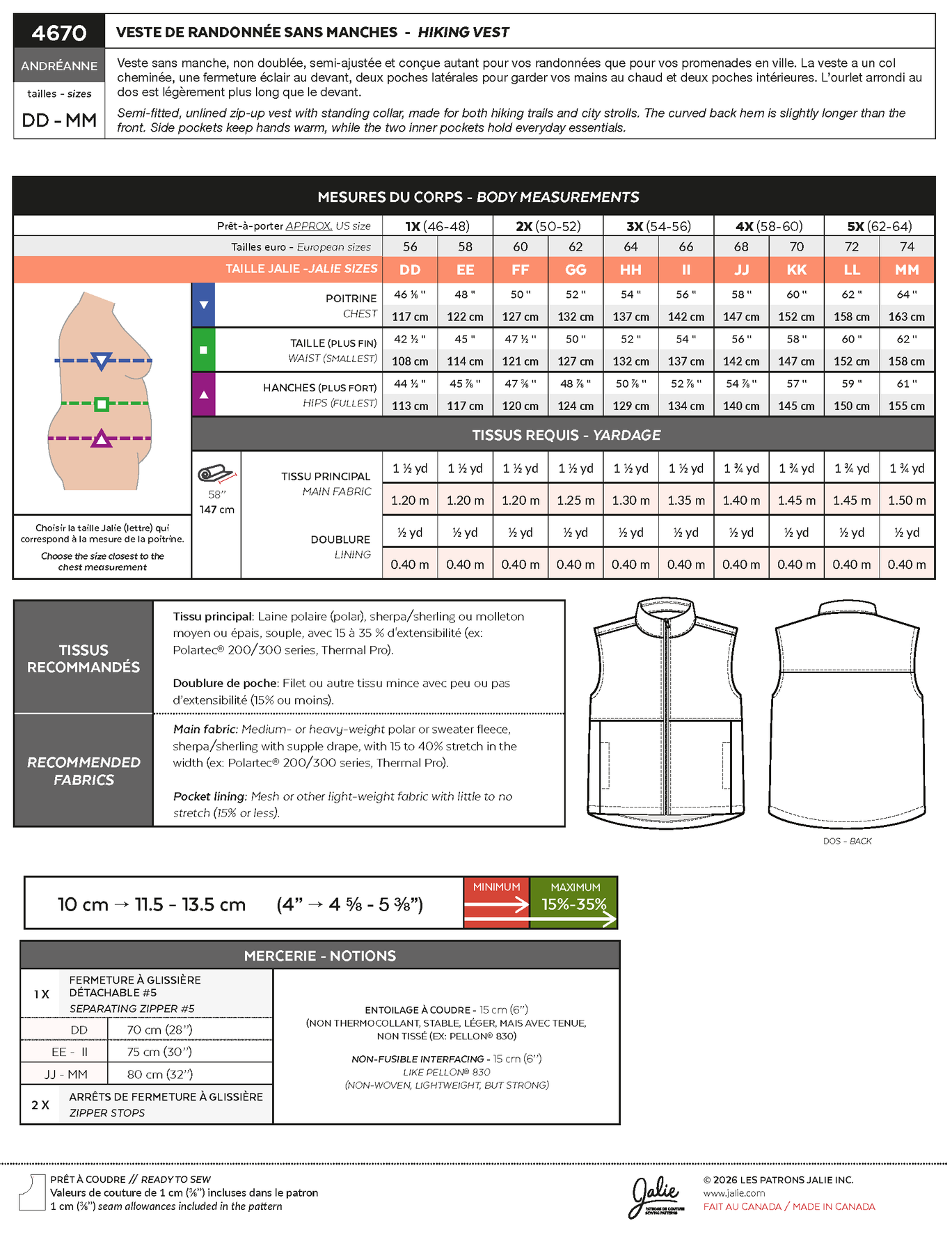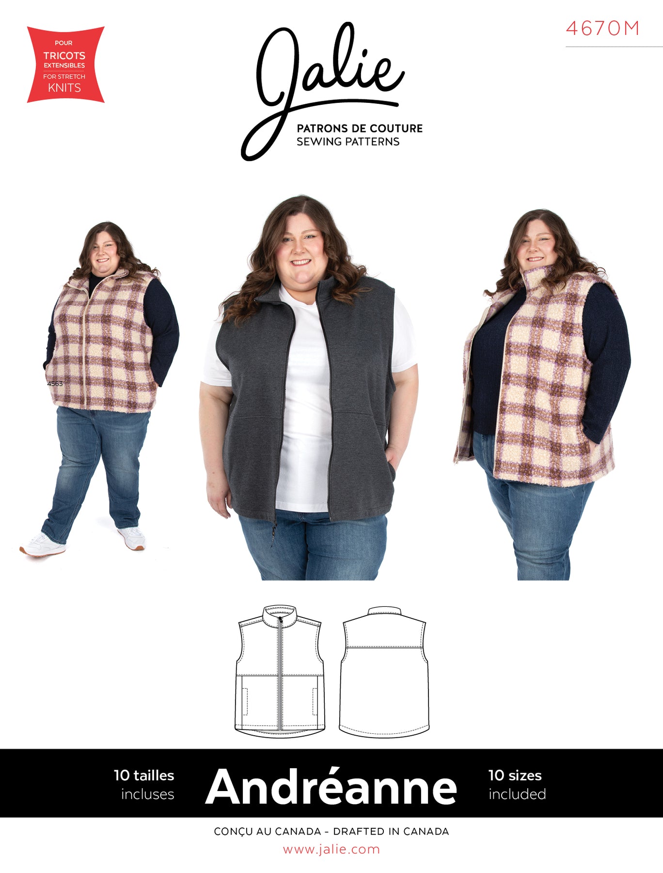 Andréanne est un patron de couture pour une veste sans manche, non doublée, semi-ajustée et conçue autant pour vos randonnées que pour vos promenades en ville.