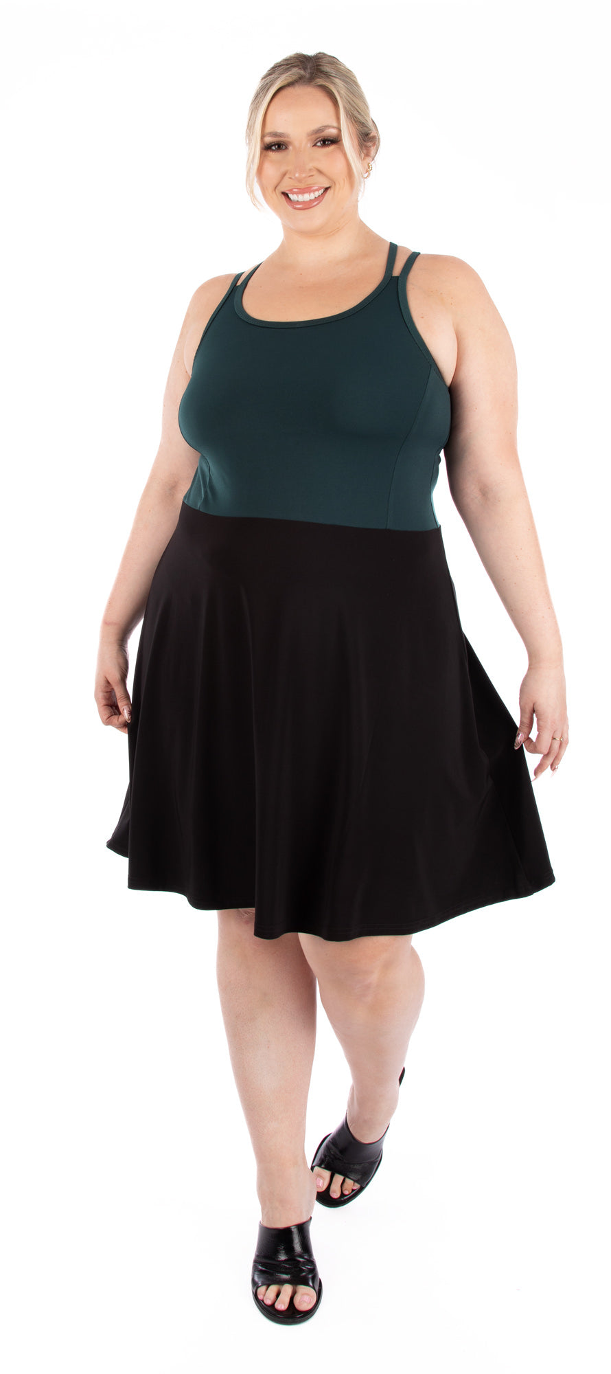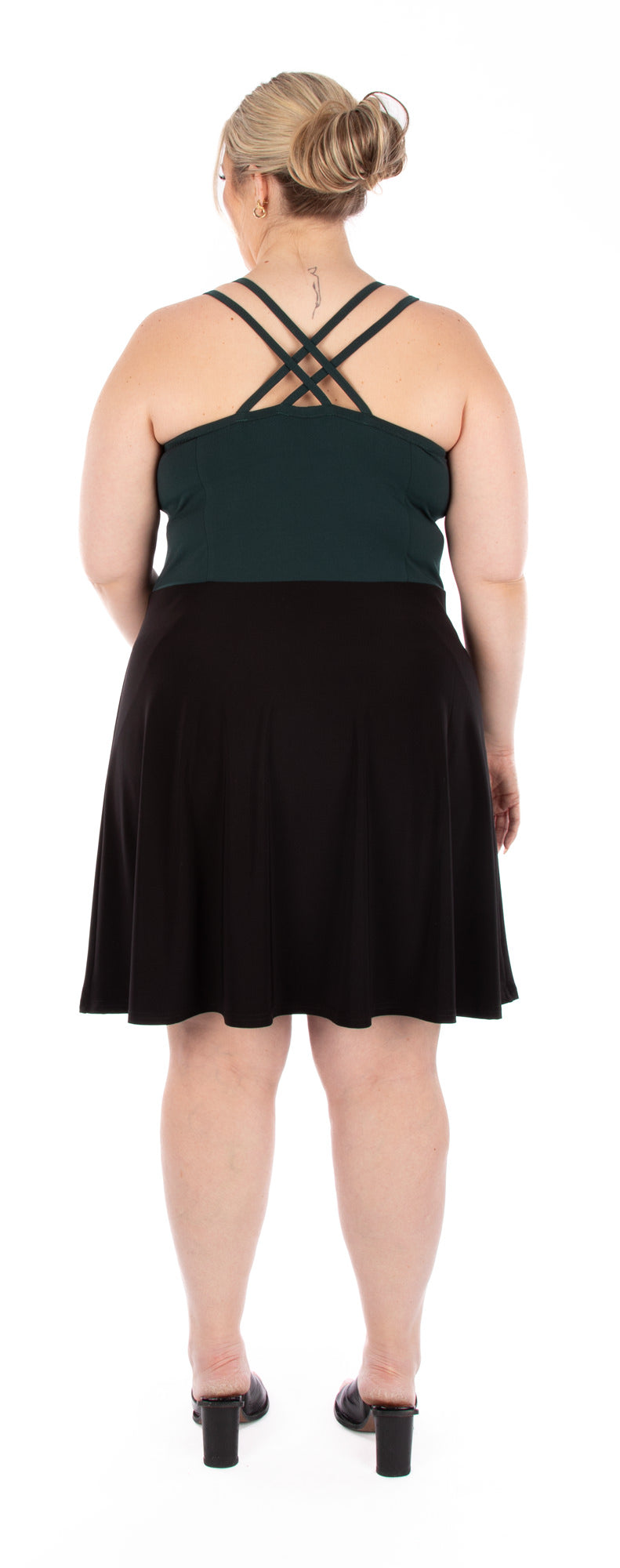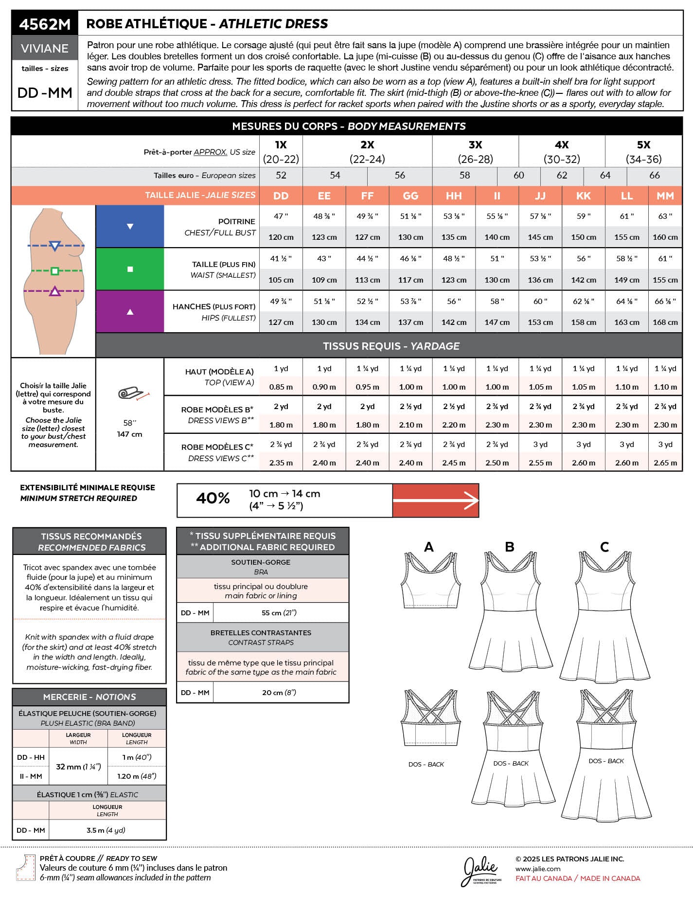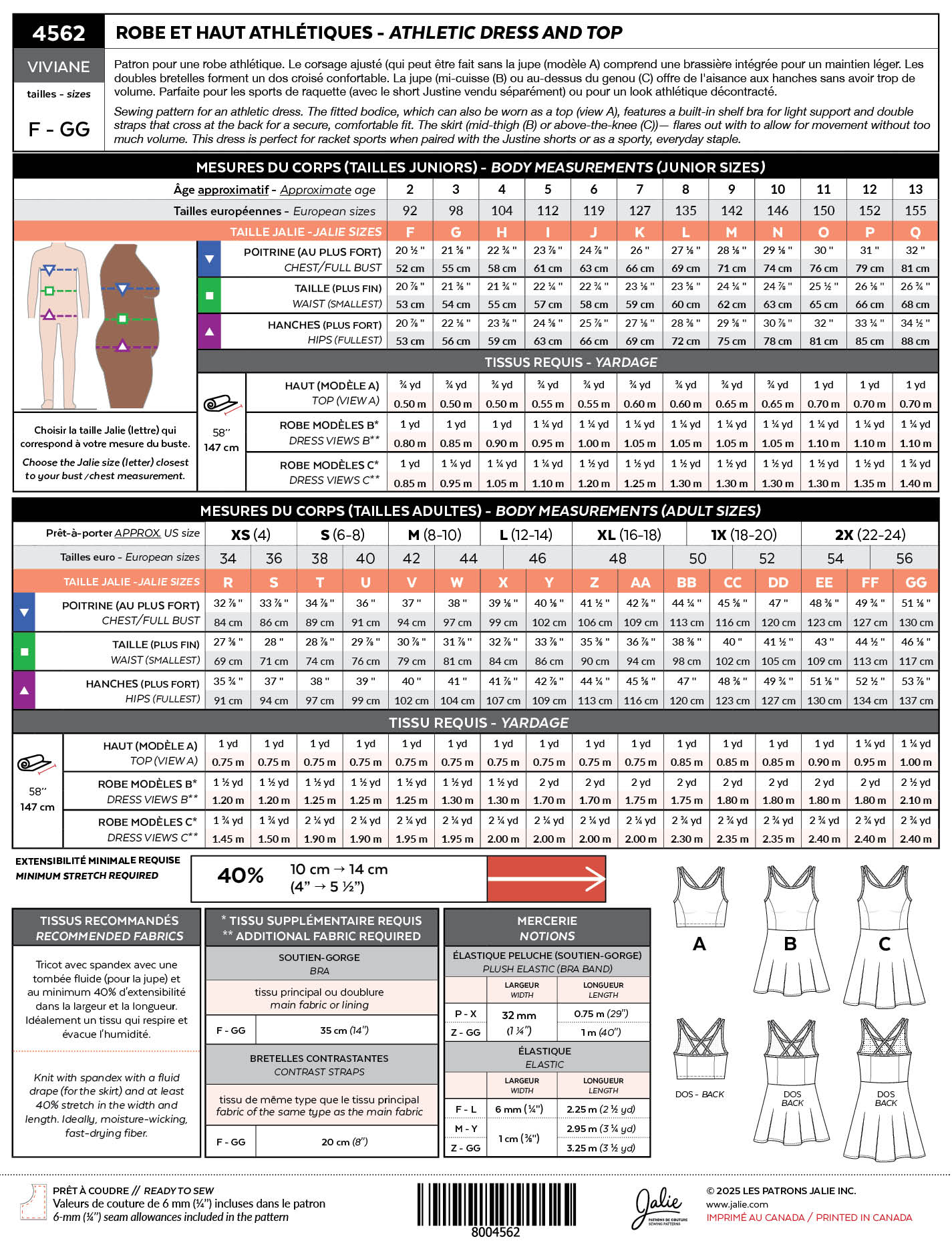 Le corsage ajusté (qui peut être fait sans la jupe (modèle A) comprend une brassière intégrée pour un maintien léger. Les doubles bretelles forment un dos croisé confortable. La jupe (mi-cuisse (B) ou au-dessus du genou (C) offre de l'aisance aux hanches sans avoir trop de volume.