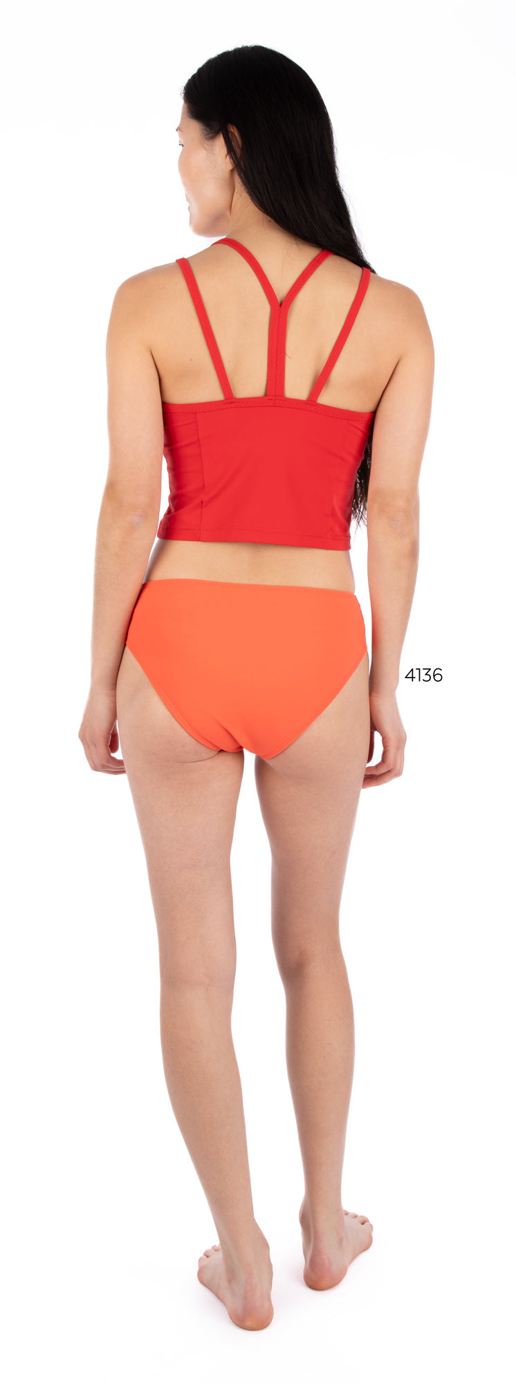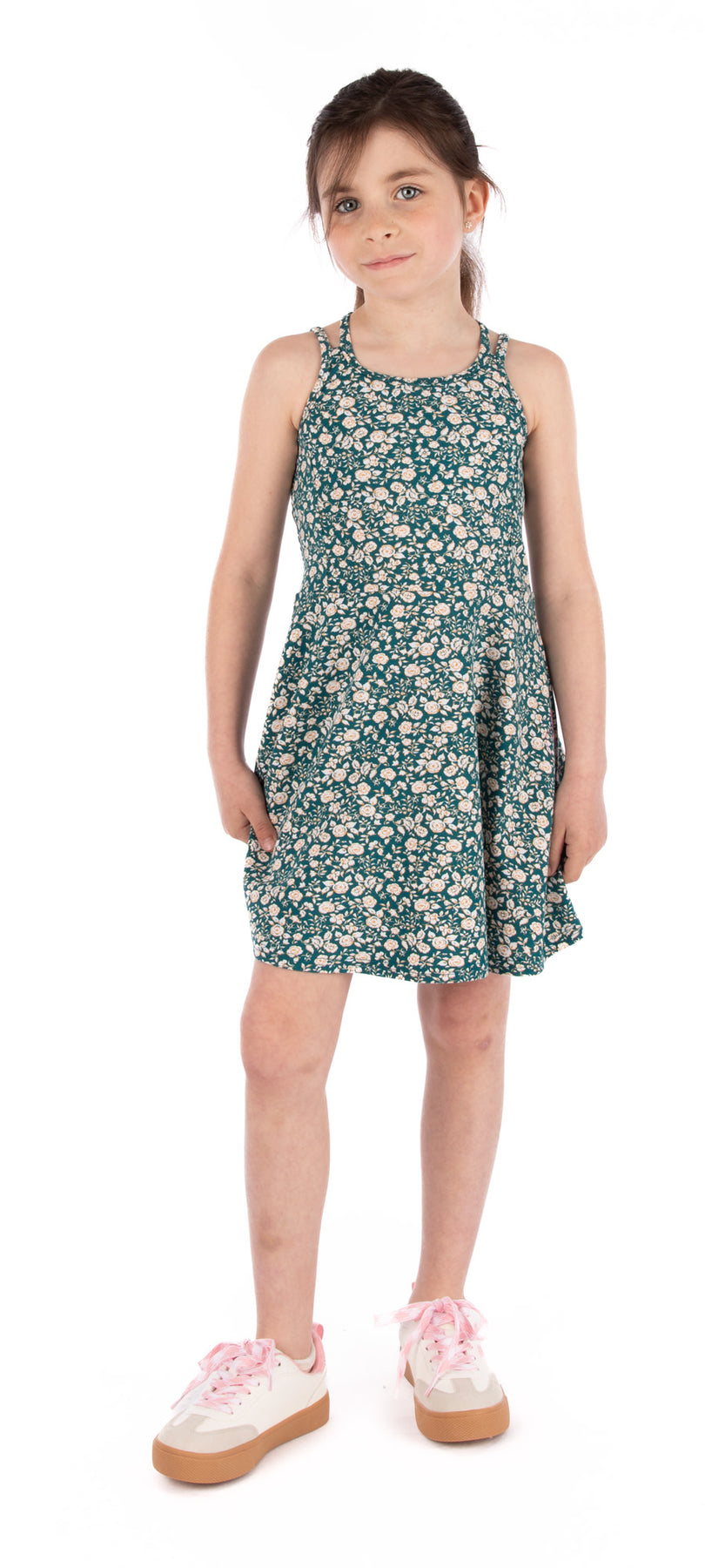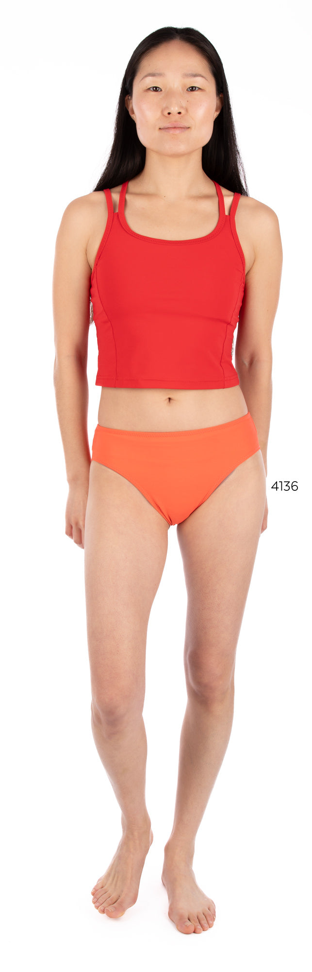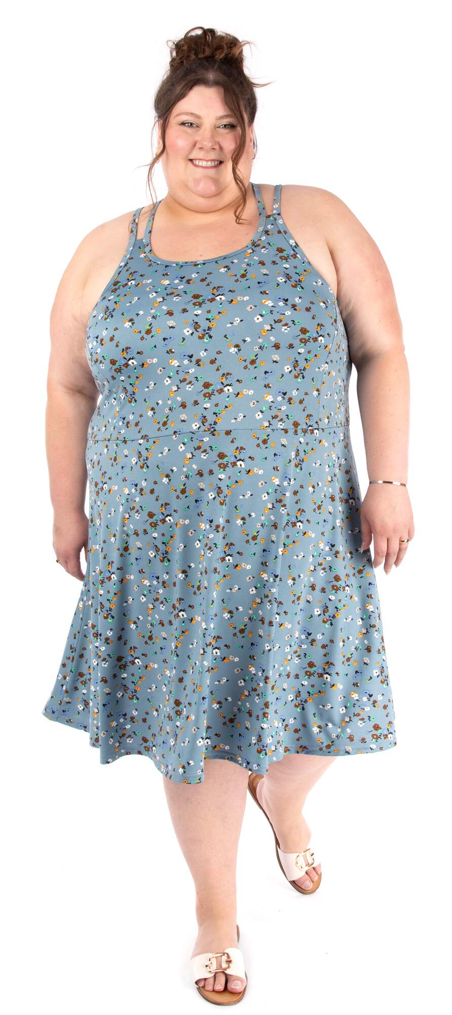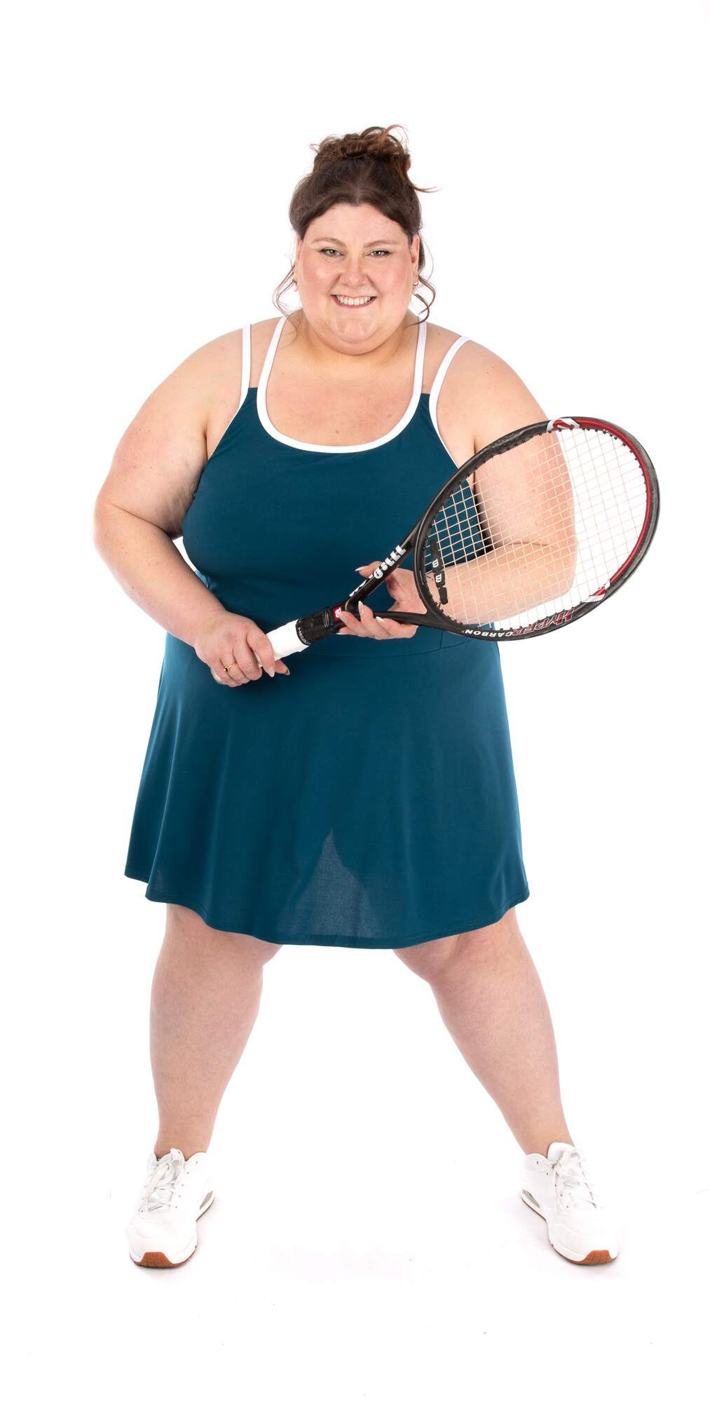Le corsage ajusté (qui peut être fait sans la jupe (modèle A) comprend une brassière intégrée pour un maintien léger. Les doubles bretelles forment un dos croisé confortable. La jupe (mi-cuisse (B) ou au-dessus du genou (C) offre de l'aisance aux hanches sans avoir trop de volume.