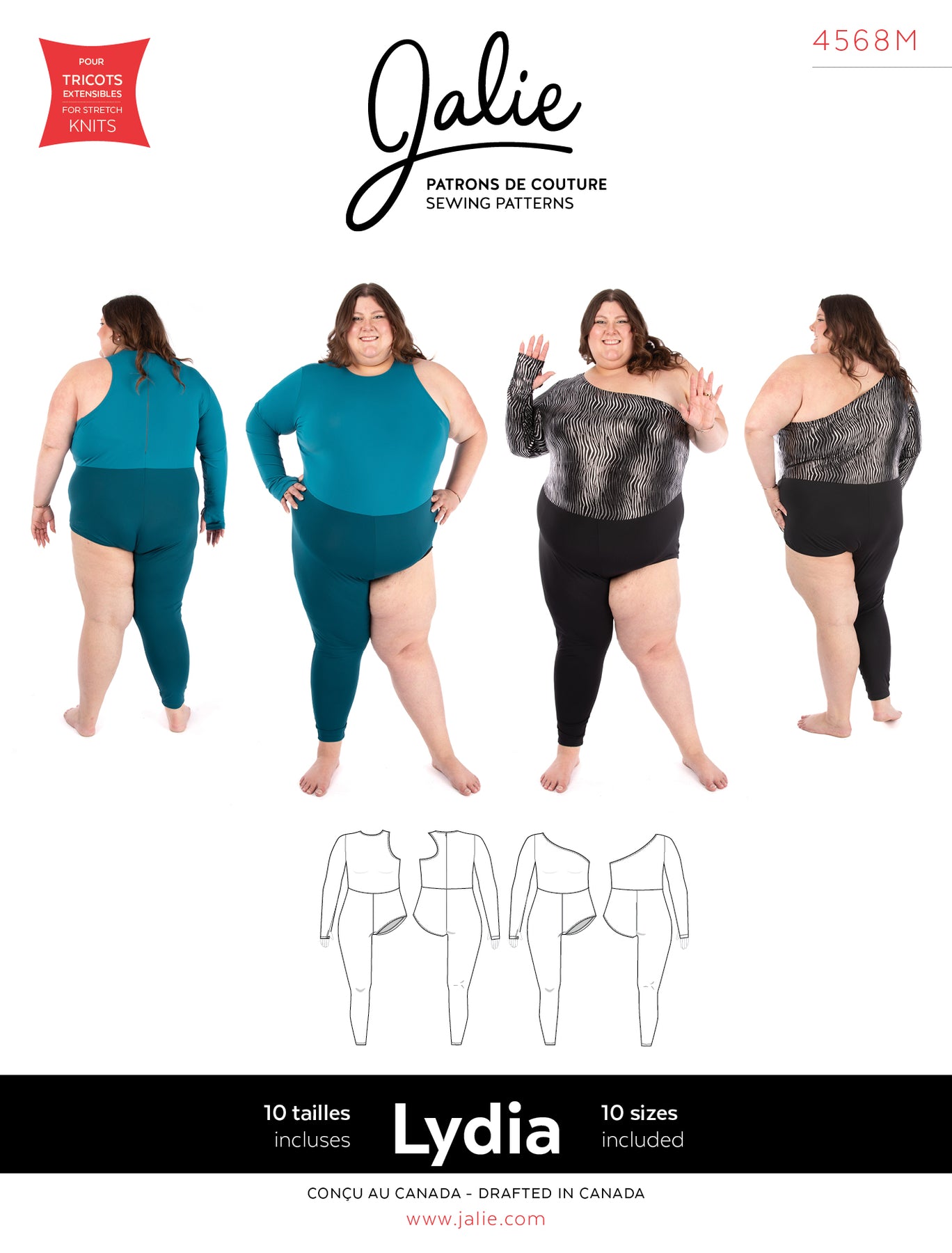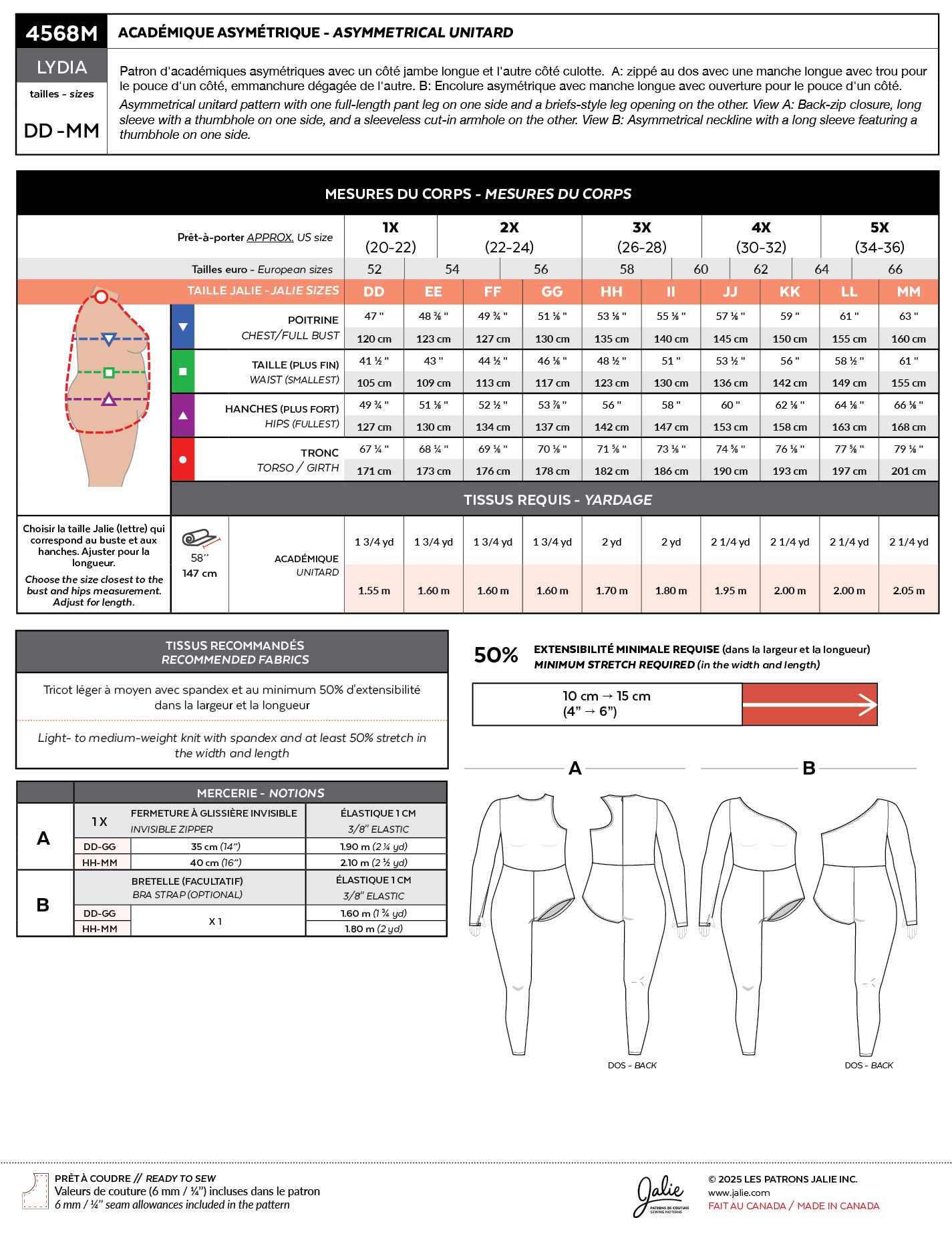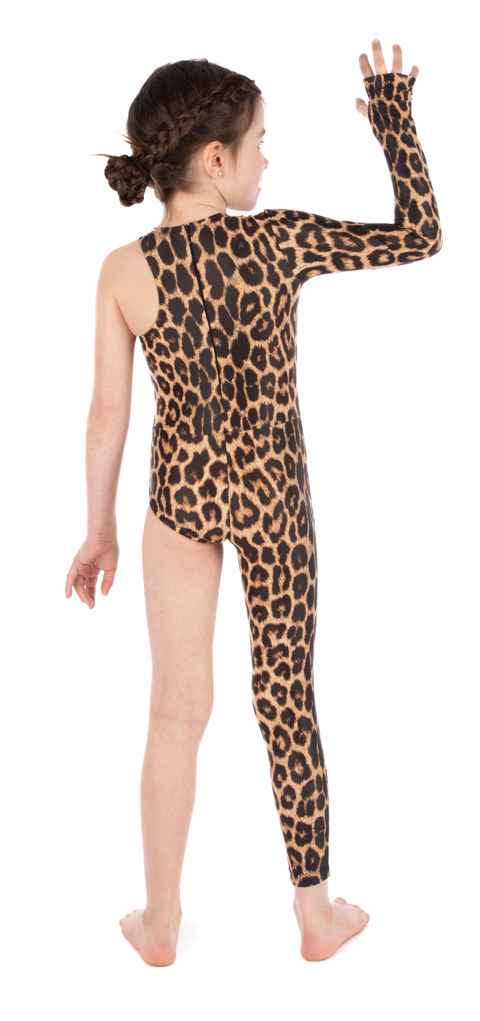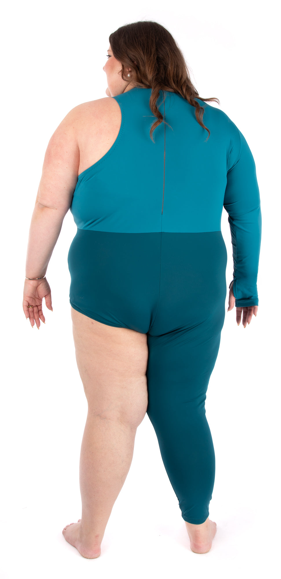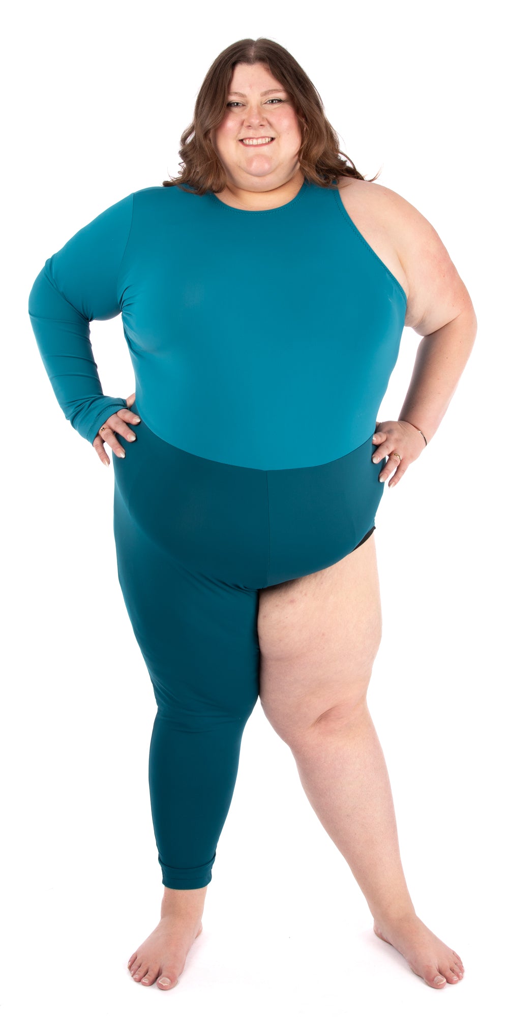 Asymmetrical unitard pattern with one full-length pant leg on one side and a briefs-style leg opening on the other.