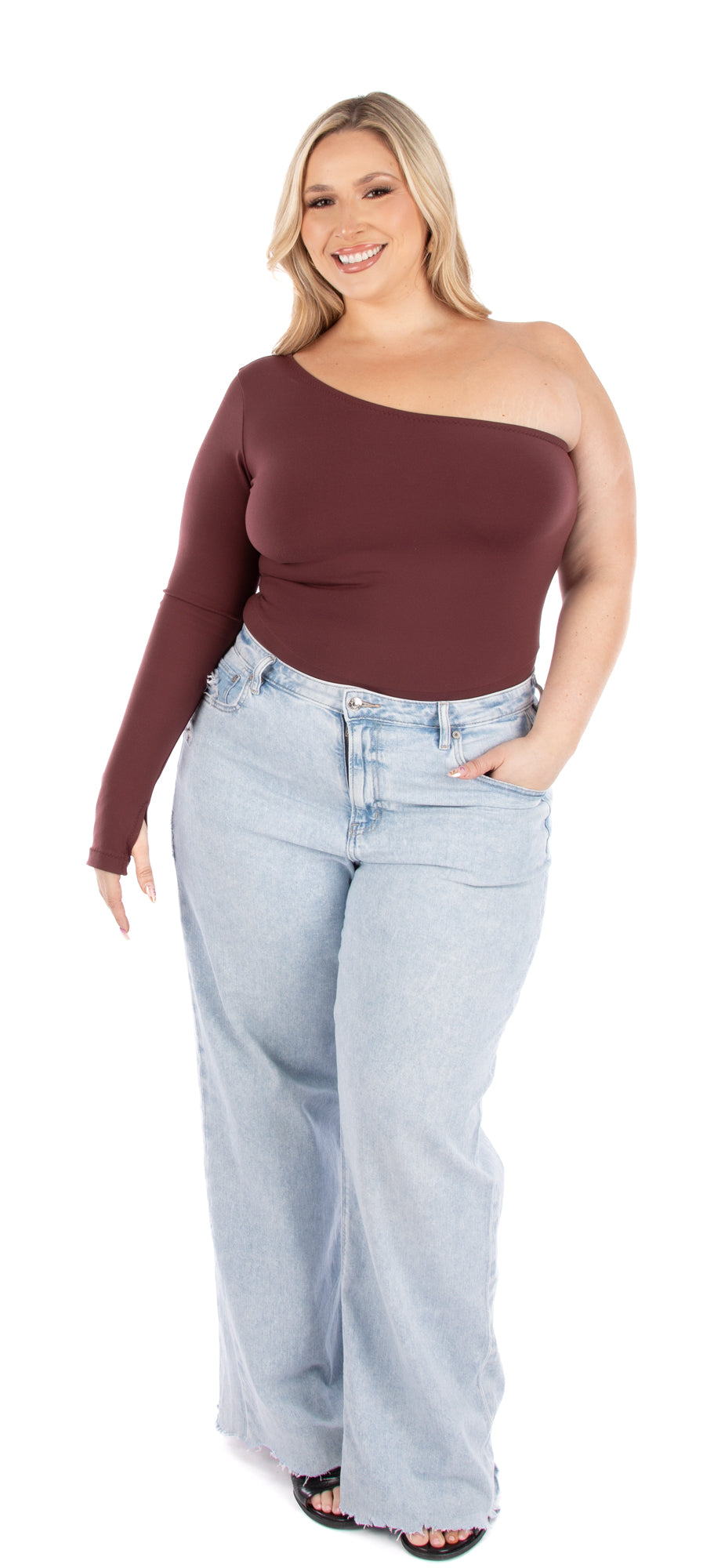 - Asymmetrical neckline with a long sleeve featuring a thumbhole on one side.