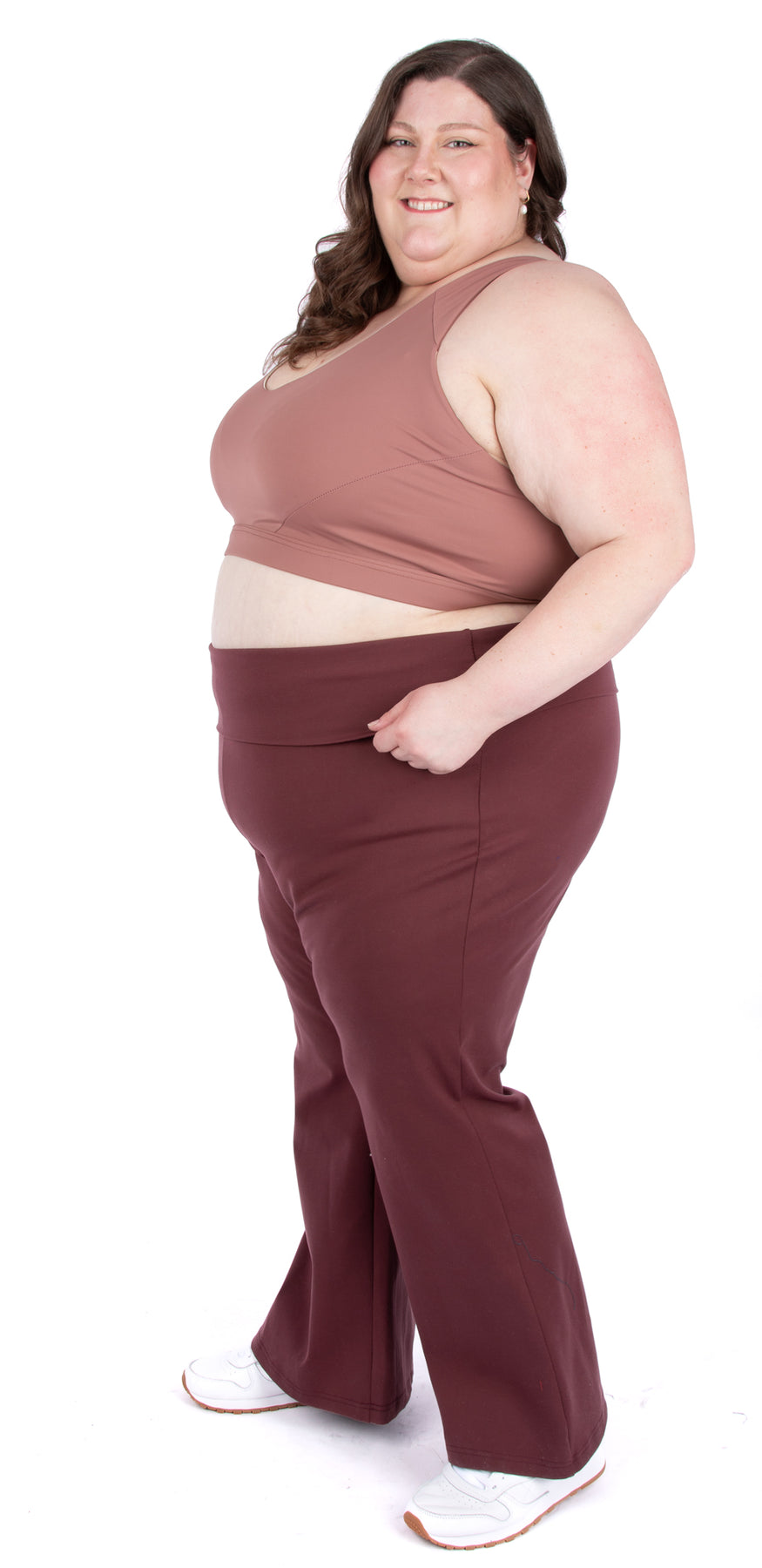 This sewing pattern for pull-on pants and shorts with a clever waistband gives the look of a foldover style without the fuss! It is very fitted through the thighs and flared from the knee down for a 2000s-inspired yoga pant silhouette.