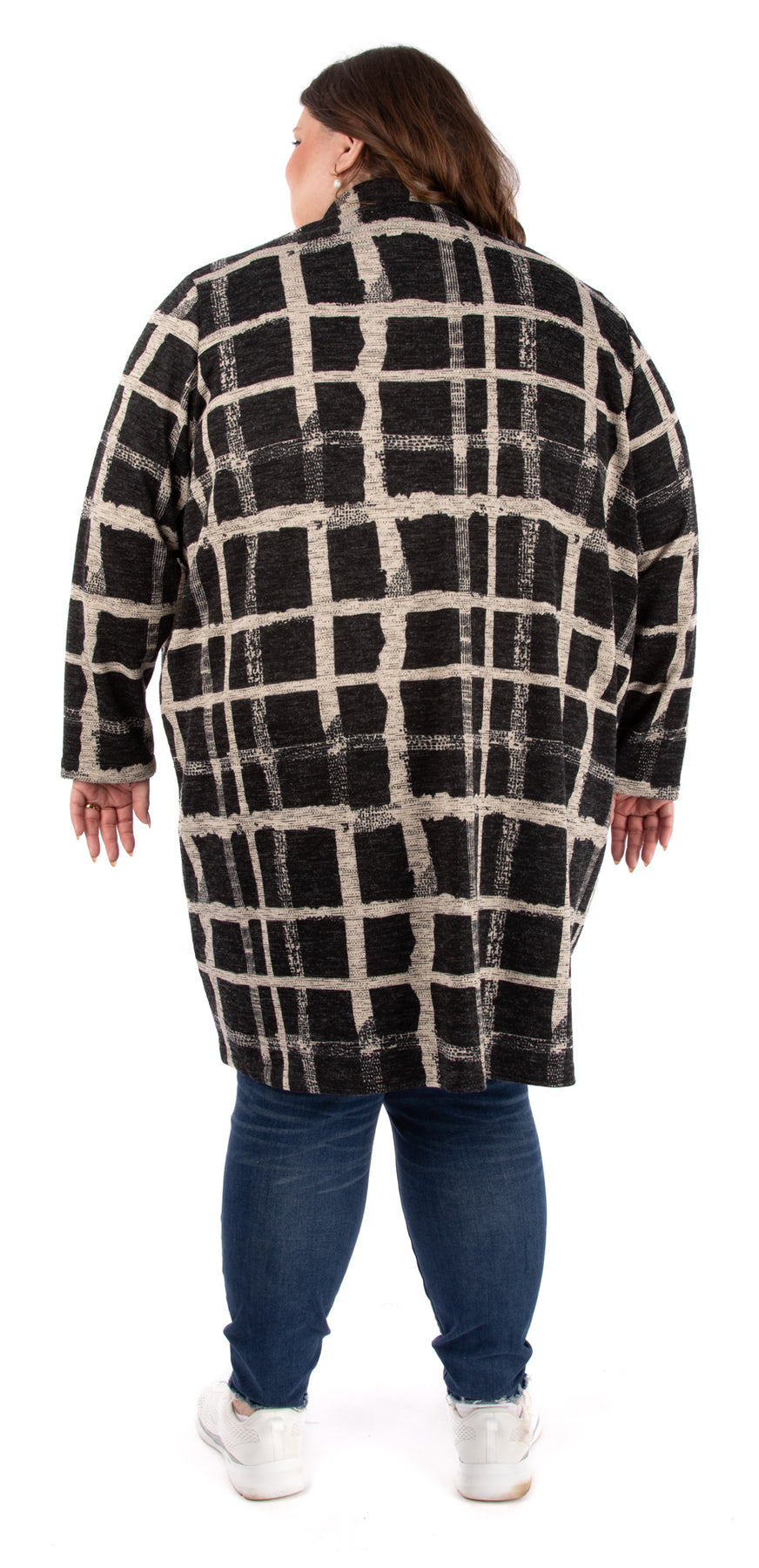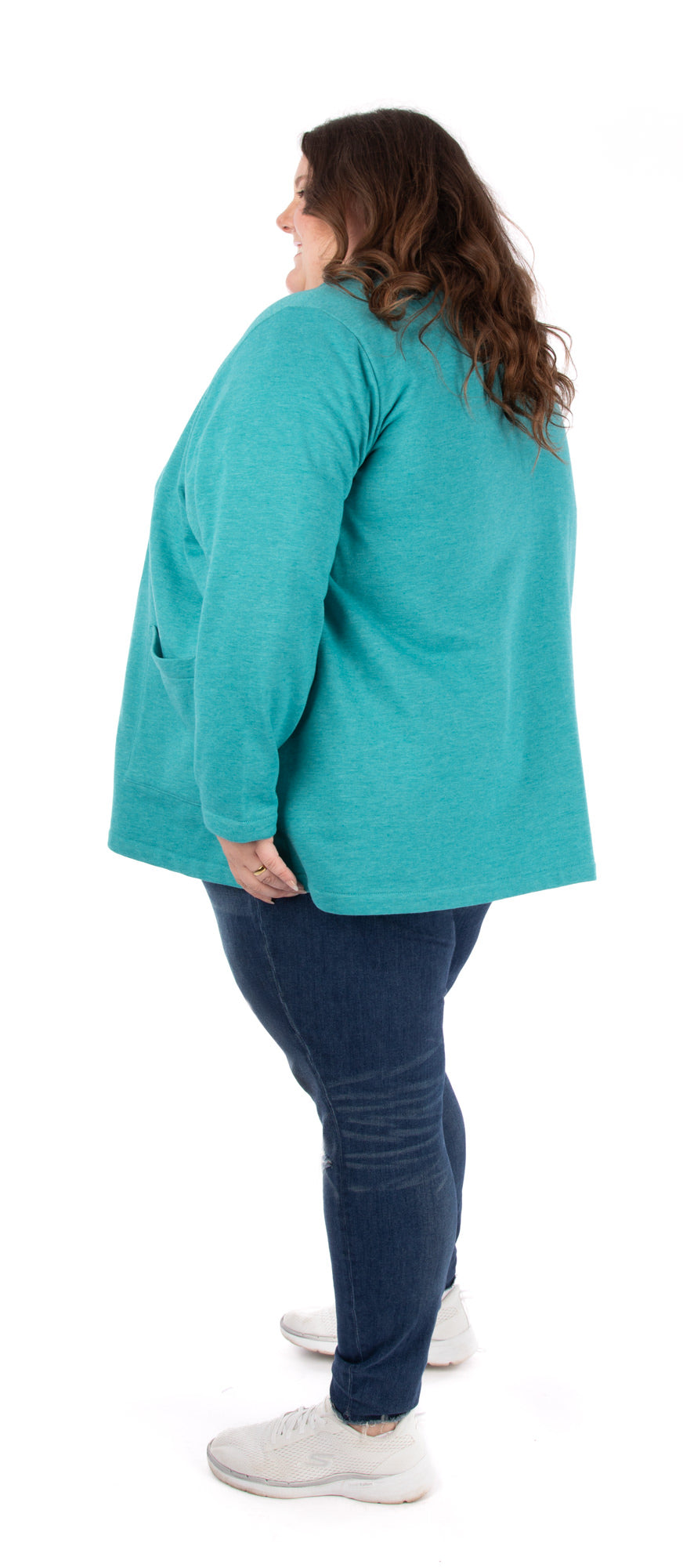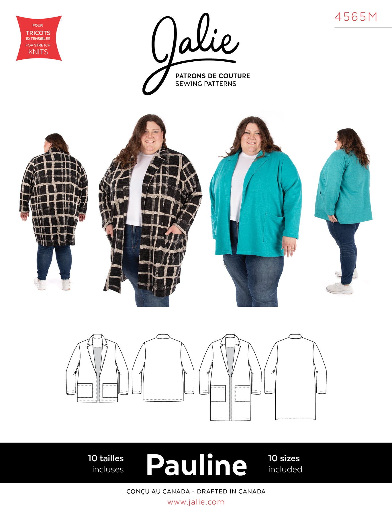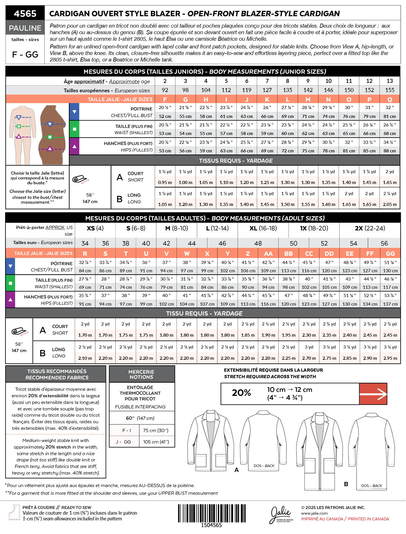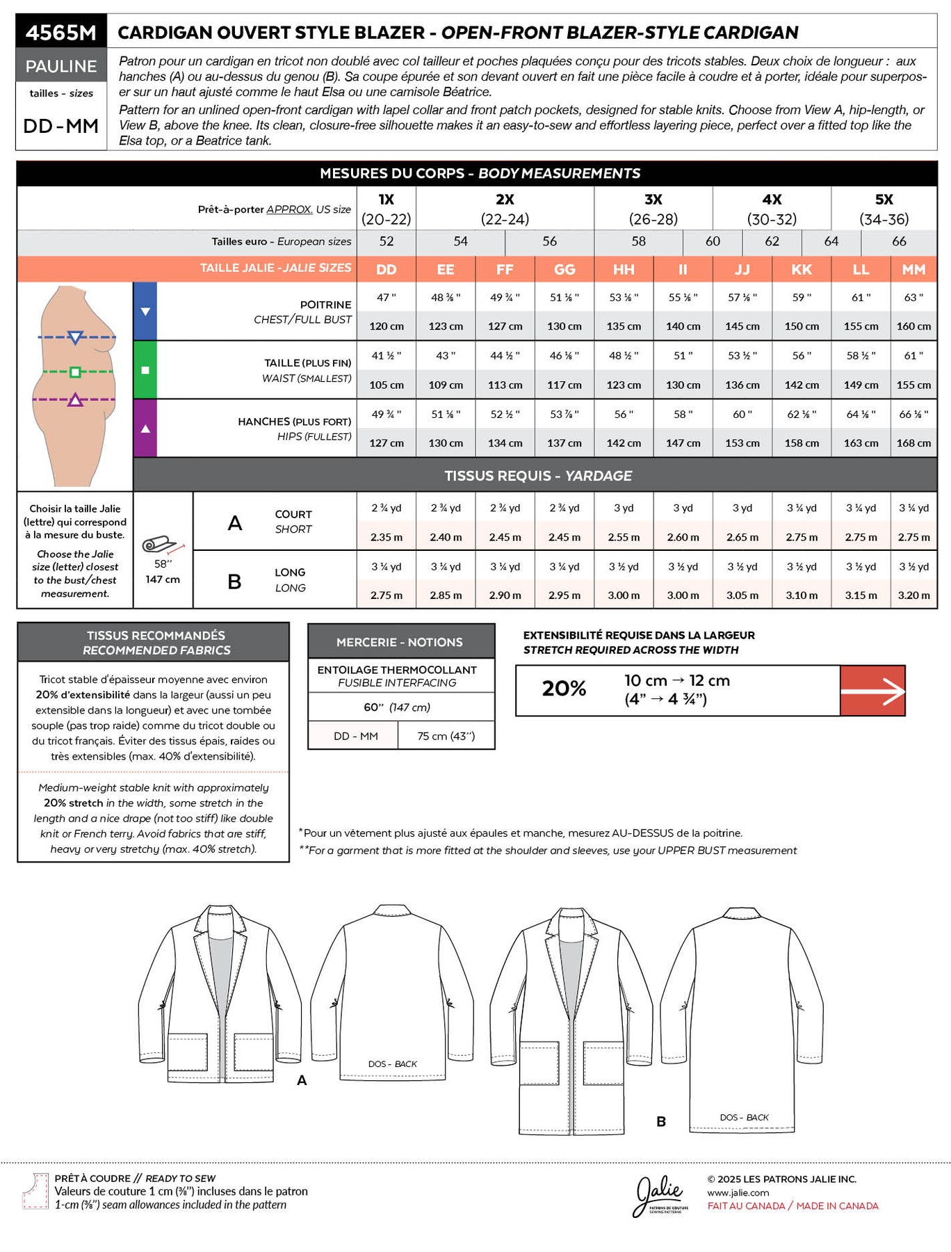The Pauline pattern for an unlined open-front cardigan with lapel collar and front patch pockets is designed for stable knits. Choose from View A, hip-length, or View B, above the knee.