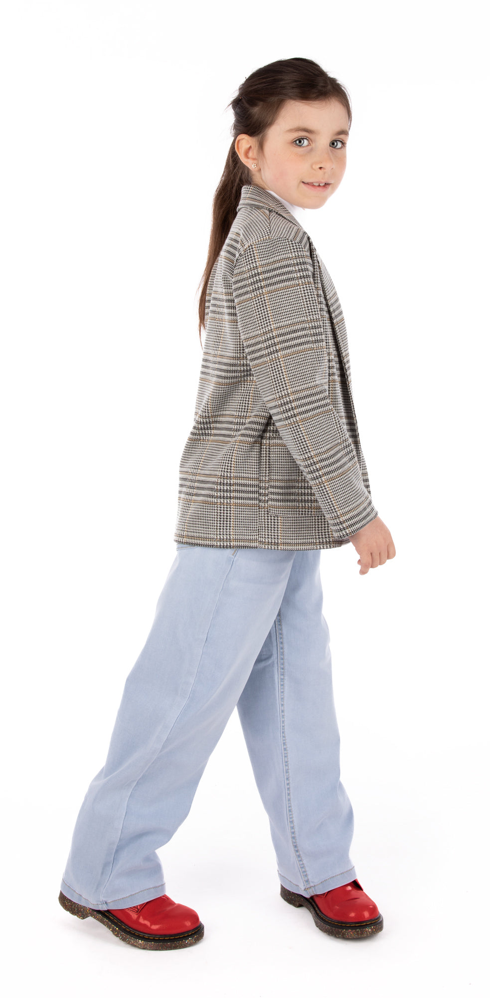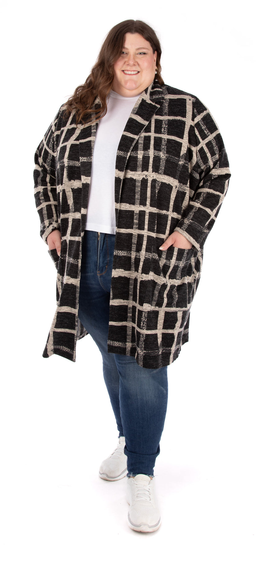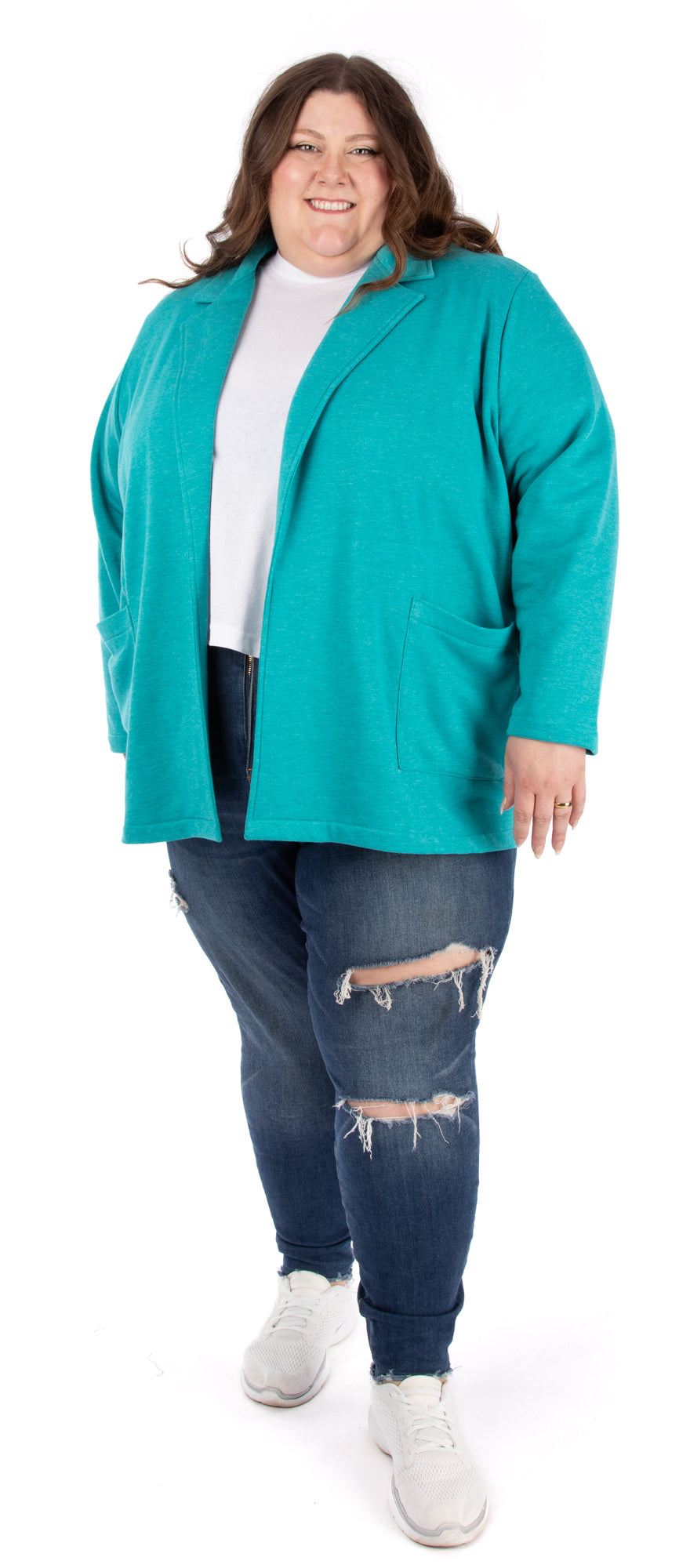 Marianne (size MM) wears both blazers over a Laurent