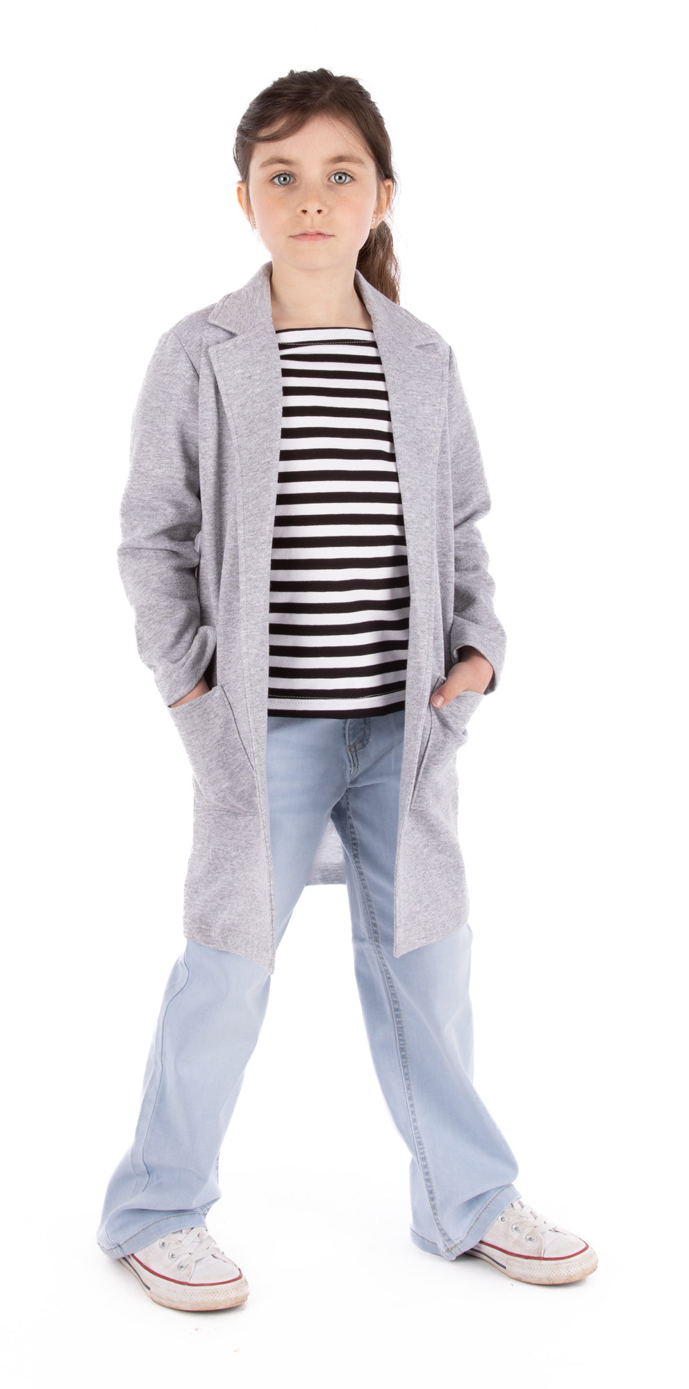 Romy (size I) wears her jackets over Manon boatneck tops