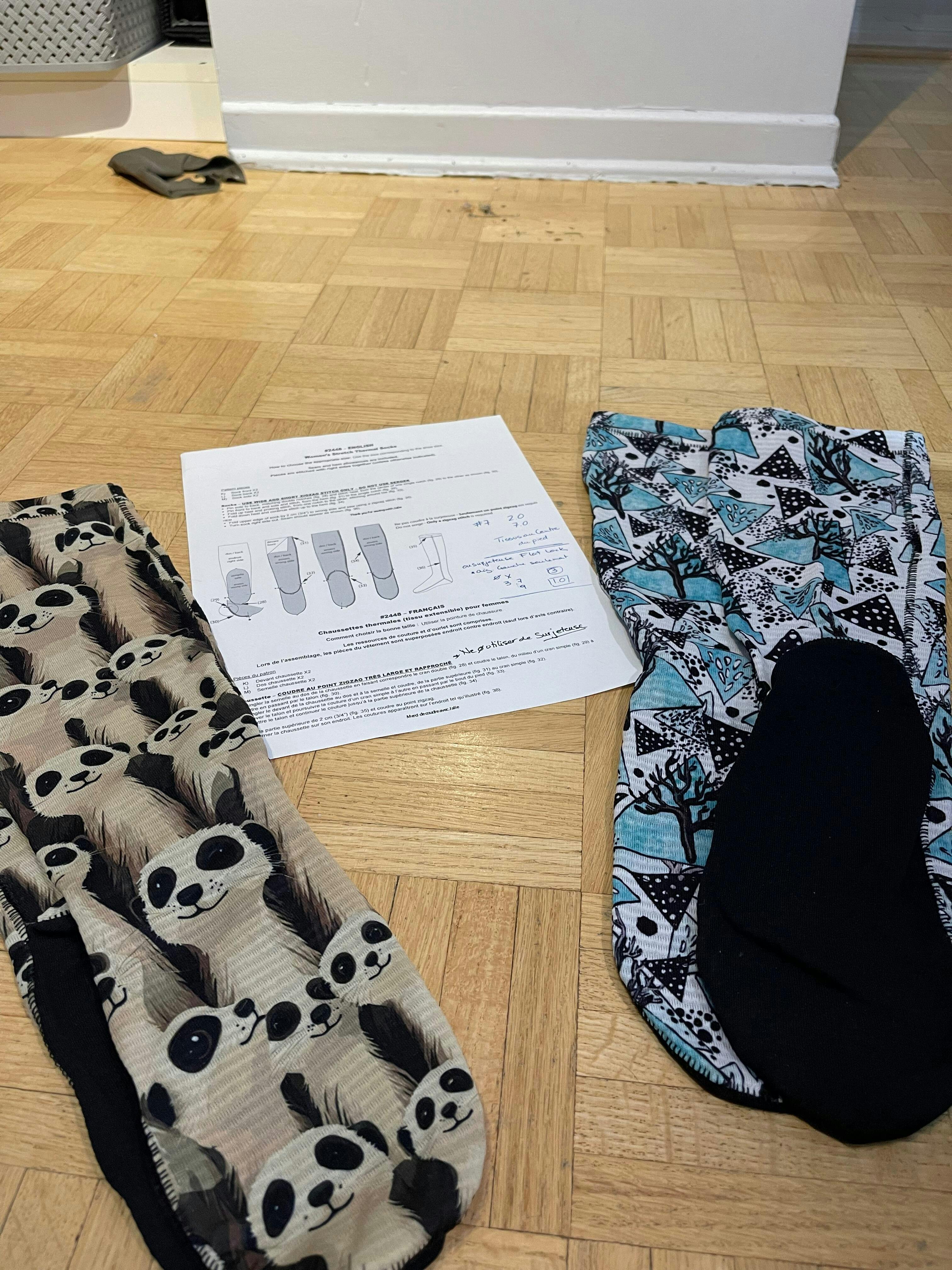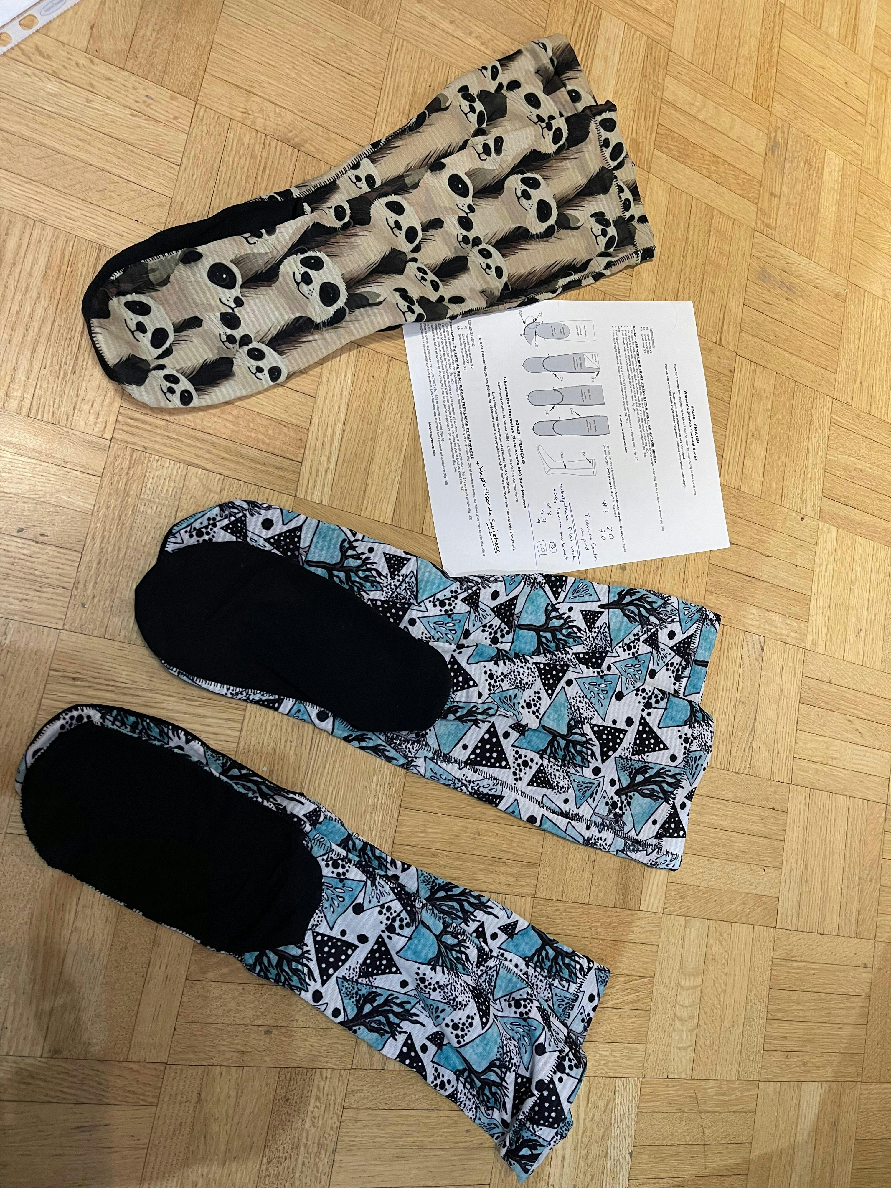 Bravo Jalie pour ce patron qui me permet d'utiliser les retailles au lieu de les jeter. Des bas éclair, cousus en 20 minutes au premier essai. Fantastique. Et ils sont confortables en plus. Merci pour le tuto sur YouTube. Le reste de la famille aura bientôt les pieds bien au chaud.